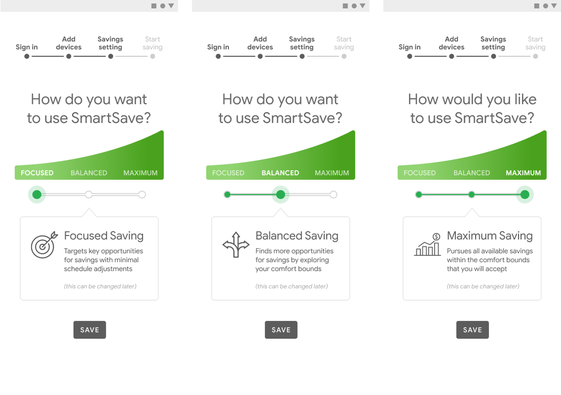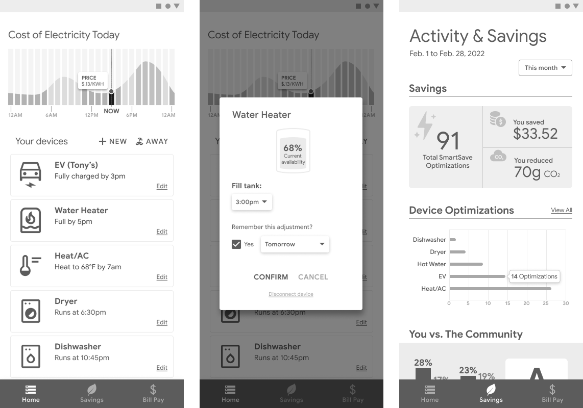 Designed wireframes for connecting devices, tracking savings, and seeing clean-energy impact.